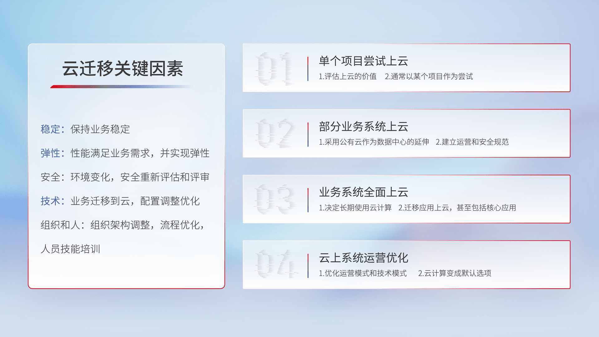 结合实际业务,,从规划设计、、云平台选型、、、云原生改造、、、、数据迁移、、集成交付,,迁移全过程为客户识别最佳上云路径,,,,做好风险识别管理,,,,设计网络架构、、身份权限、、、安全审计合规、、、、操作审计、、、、日志审计、、监控告警策略、、多站点容灾设计等,,,对云上基础设施进行整体规划,,,提升IT治理水平,,以满足弹性、、、高可用、、高性能的需求。。。。
